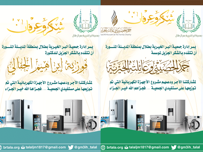 الحمد لله رب العالمين والصلاة والسلام على نبينا محمد وآله وصحبه أجمعين أما بعد تمت زيارة جمعية البر بمركز طلال اليوم الاربعاء الموافق 7/4/1441هـ وسرنا ما شاهدنا من إنجازات ومشاريع وأطلعنا على تقرير العام الماضي ثمار عطاؤكم الذي اشتمل على 18 مشروعاً يخدم سكان مركز طلال وفيه من التنوع مثل ترقيم المساكن وكسوة الشتاء والحقيبة المدرسية وغيرها . فيسرنا أن نتقدم بالشكر والتقدير لرئيس الجمعية الأستاذ / ممدوح جري المطيري وجميع أعضاء مجلس الإدارة على الجهود المباركة التي تبذل في هذا الصرح المبارك . نسأل الله للجميع التوفيق والسداد