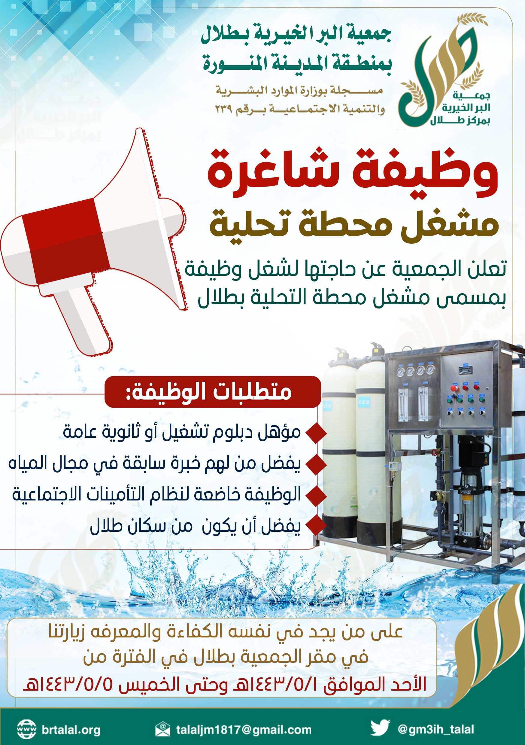 تعلن جمعية البر الخيرية بمركز طلال عن حاجتها لشغل وظيفة حارس بمحطة تحلية المياه التابعة للجمعية
