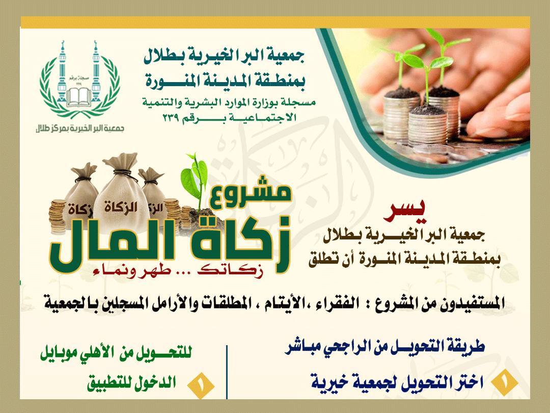 مشروع زكاة المال: الجمعية تطلق مشروع زكاة المال وتدعو رجال البر والعطاء للمساهمة بزكاة أموالهم دعماً لمشاريع الجمعية وبرامجها