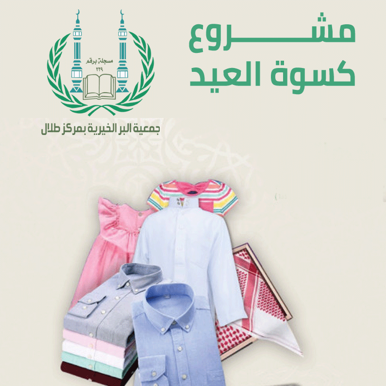 منظر جميل يوضـح فرحة المسلمين بالعيد فمظـاهر الفـرح عديدة منها ارتـداء ألبسة جـديـدة في عيد الفطر المبارك ، حيث استطاعت جمعية البر بجدة من خلال برنامج (كسوة العيد) غرس السعادة في نفوس الفقراء والمحتاجين وخاصة الأطفال الأيتام ليشاركوا الأغنياء فرحتهم بعيد الفطر المبارك ولاتكتمل المشاركة بالفرحة إلا بتبرعات المحسنين أمثالكم .قال الله تعالى : ( يَسْأَلُونَكَ مَاذَا يُنْفِقُونَ قُلْ مَا أَنْفَقْتُمْ مِنْ خَيْرٍ فَلِلْـوَالِدَيْنِ وَالْأَقْـرَبِينَ وَالْيَتَامَى وَالْمَسَاكِينِ وَابْنِ السَّبِيلِ وَمَا تَفْعَلُوا مِنْ خَيْرٍ فَإِنَّ اللَّهَ بِهِ عَلِيمٌ﴾ ) البقرة : (215) ، وفي الحديث : عن أبي سعيد الخدري – (رضي الله عنه) قال : قال رسول الله صلى الله عليه وسلم : ( أَيُّمَا مُسْلِمٍ كَسَا مُسْلِمًا ثَوْبًا عَلَى عُرْيٍ كَسَاهُ اللَّهُ مِنْ خُضْرِ الْجَنَّةِ )» . رواه أبو داود .